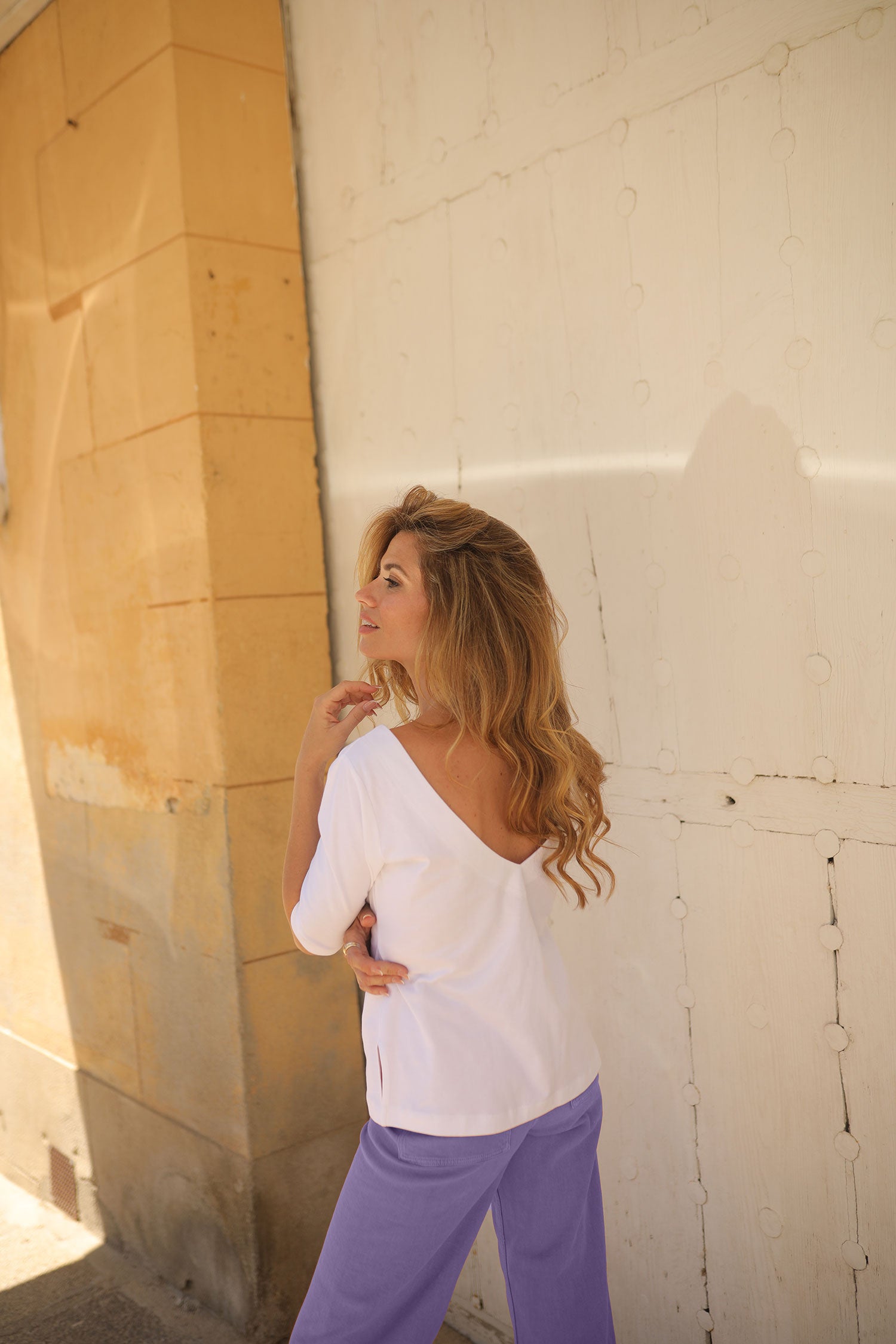 Canali, gondole, maschere e spaghetti, sì, è Venecia! This three-quarter sleeve tee has a boat neck inspired by gondoliers but an open back line in a low-cut V shape.